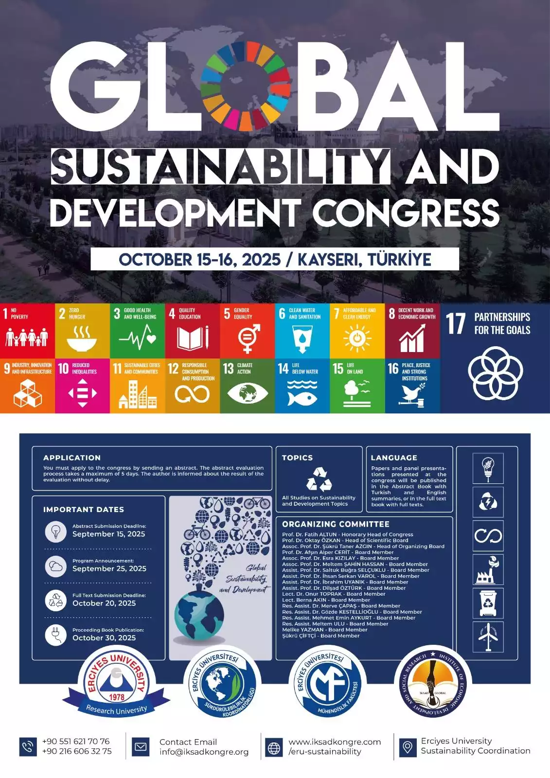 I. Uluslararası Küresel Sürdürülebilirlik ve Kalkınma Kongresi (International Global Sustainability and Development Congress), 15-16 Ekim 2025 tarihlerinde Fakültemiz F Blok Konferans Salonunda düzenlenecektir.
