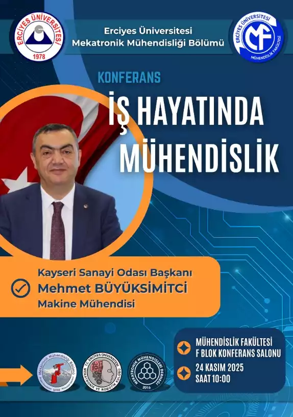 Fakültemiz Mekatronik Mühendisliği Bölümü tarafından düzenlenen, Kayseri Sanayi Odası Başkanı ve Makine Mühendisi Mehmet BÜYÜKSİMİTCİ’nin konuşmacı olarak yer alacağı "İş Hayatında Mühendislik" Konferansı, 24 Kasım 2025 Pazartesi günü saat 10:00’da, Fakültemiz F Blok Konferans Salonunda gerçekleştirilecektir.