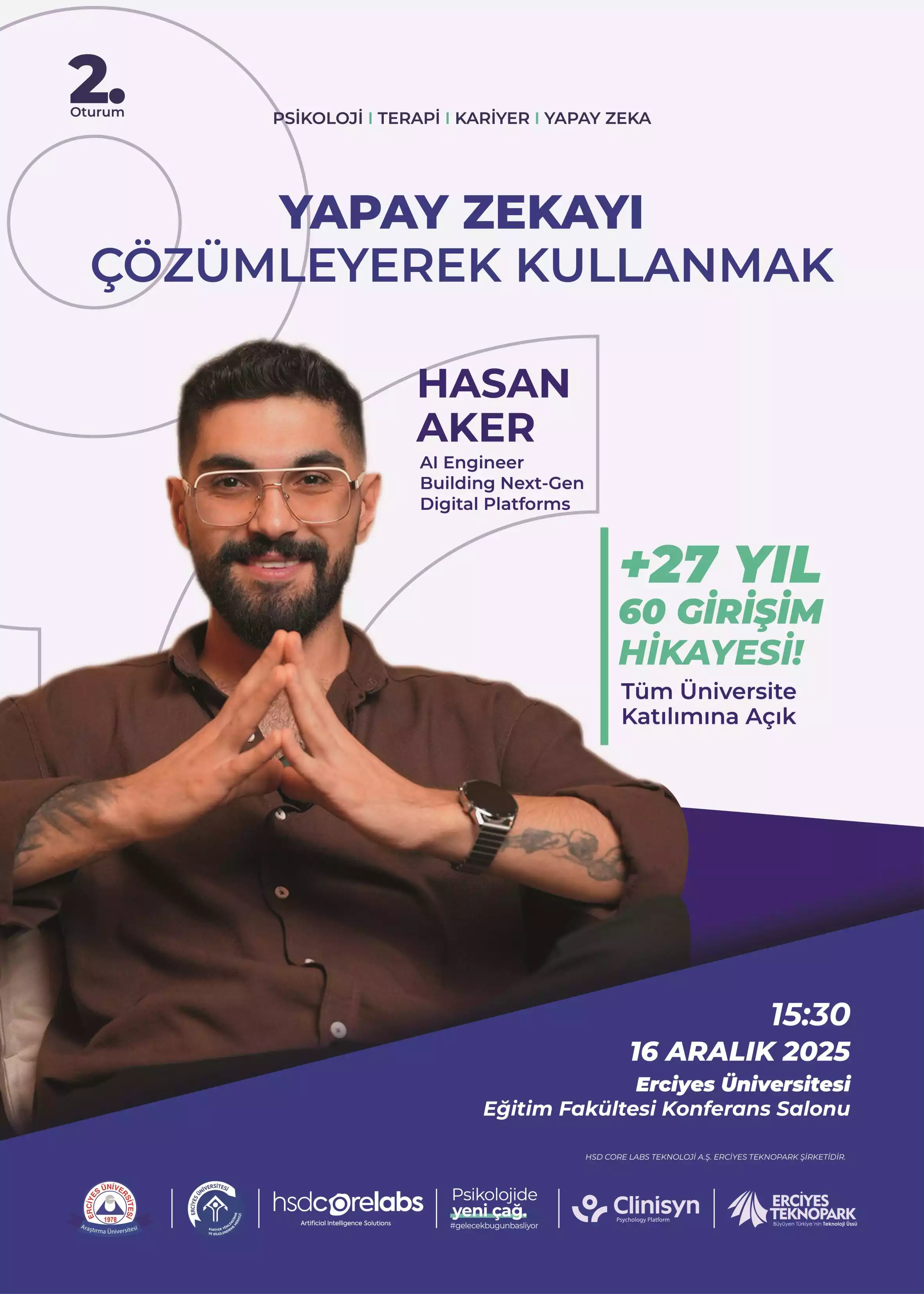 Sn. Merve Arzu HAMURCU'nun katılımıyla 16 Aralık 2025 tarihinde saat 15.30'da, Eğitim Fakültesi Konferans Salonu'nda, "Yapay Zekâyı Çözümleyerek Kullanmak" adlı söyleşi programı gerçekleştirilecektir.