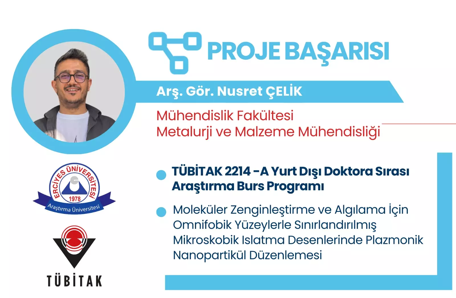 Yürütücülüğünü Fakültemiz Metalurji ve Malzeme Mühendisliği Bölümü Arş. Gör. Nusret ÇELİK'in yapacağı, "Moleküler Zenginleştirme ve Algılama İçin Omnifobik Yüzeylerle Sınırlandırılmış Mikroskobik Islatma Desenlerinde Plazmonik Nanopartikül Düzenlemesi” başlıklı proje, TÜBİTAK 2214-A Yurt Dışı Doktora Sırası Araştırma Burs Programı kapsamında destek almaya hak kazanmıştır.