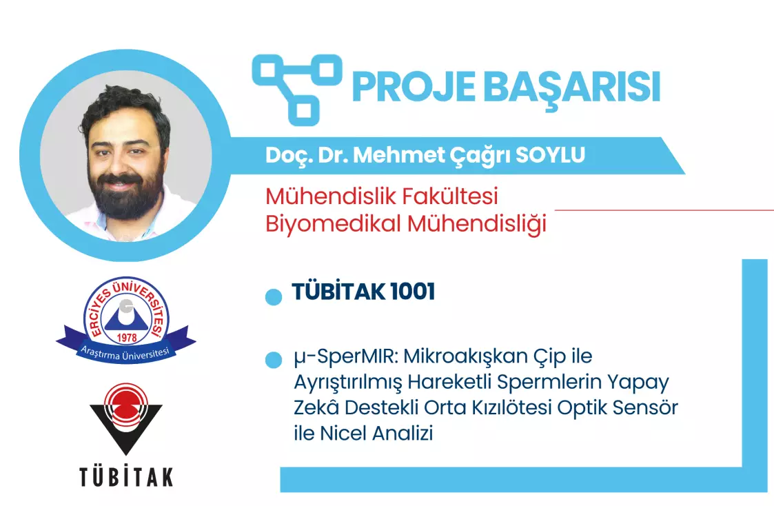 Fakültemiz Biyomedikal Mühendisliği öğretim üyesi Doç. Dr. Mehmet Çağrı SOYLU'nun yürütücü; İhsan Doğramacı Bilkent Üniversitesinden Doç. Dr. Emine Yegân ERDEM'in danışman ve Üniversitemiz Tıp Fakültesi Üroloji Ana Bilim Dalından Doç. Dr. Emre Can AKINSAL'ın araştırmacı olduğu "µ-SperMIR: Mikroakışkan Çip ile Ayrıştırılmış Hareketli Spermlerin Yapay Zekâ Destekli Orta Kızılötesi Optik Sensör ile Nicel Analizi” başlıklı proje, TÜBİTAK 1001 - Bilimsel ve Teknolojik Araştırma Projelerini Destekleme Programı kapsamında desteklenmeye hak kazanmıştır.