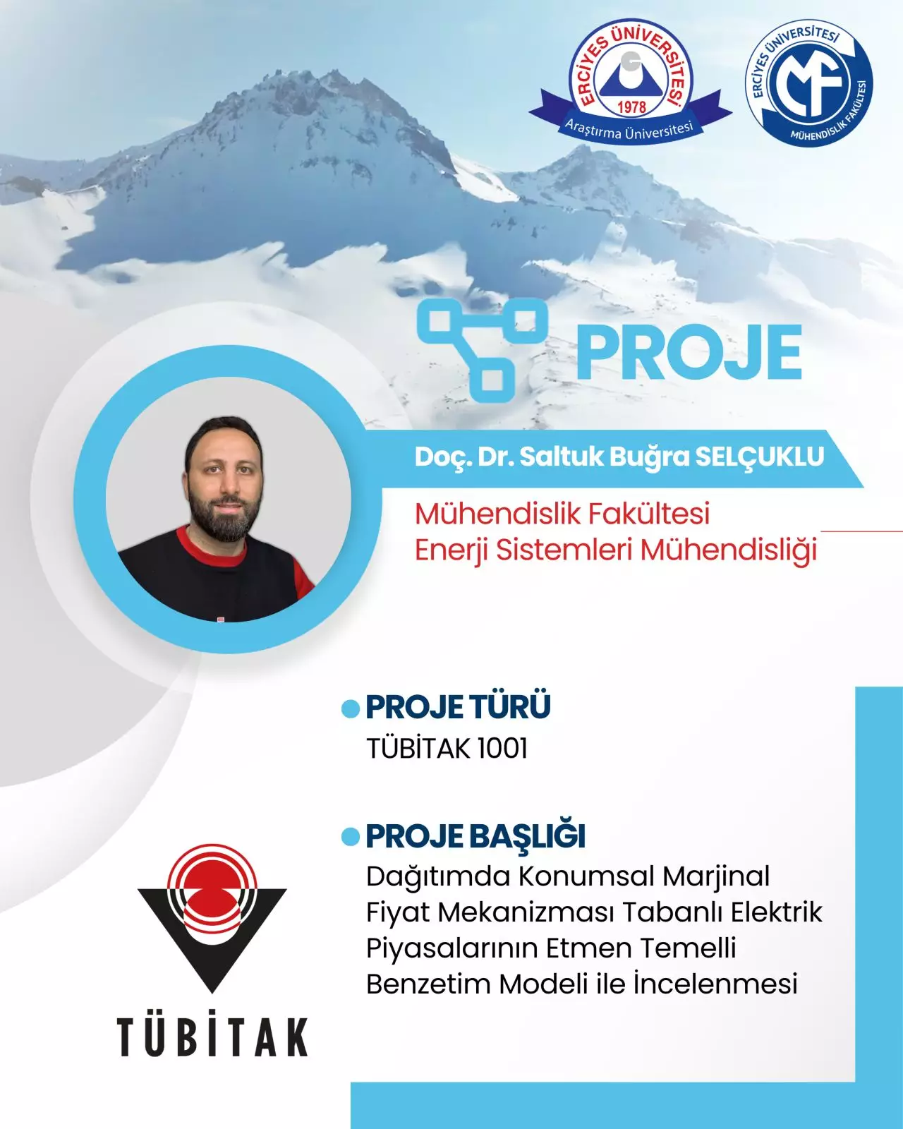 Fakültemiz Enerji Sistemleri Mühendisliği Bölümü öğretim üyesi Doç. Dr. Saltuk Buğra SELÇUKLU'nun yürütücü; Yazılım Mühendisliği bölümünden Prof. Dr. Celal ÖZTÜRK'ün danışman; Enerji Sistemleri Mühendisliği bölümünden Arş. Gör. Seda Nur BOZKURT, Yazılım Mühendisliği bölümünden Arş. Gör. Erdemhan ÖZDİN, İktisadi ve İdari Bilimler Fakültesi İktisat Bölümünden Dr. Öğr. Üyesi Erhan MUĞALOĞLU, Özyeğin Üniversitesi Elektrik-Elektronik Mühendisliği bölümünden Dr. Öğr. Üyesi Göktürk POYRAZOĞLU ve Sivas Cumhuriyet Üniversitesi Yazılım Mühendisliği bölümünden Doç. Dr. Sibel ARSLAN'ın araştırmacı olduğu, "Dağıtımda Konumsal Marjinal Fiyat Mekanizması Tabanlı Elektrik Piyasalarının Etmen Temelli Benzetim Modeli ile İncelenmesi” başlıklı proje, TÜBİTAK 1001 - Bilimsel ve Teknolojik Araştırma Projelerini Destekleme Programı kapsamında desteklenmeye hak kazanmıştır.