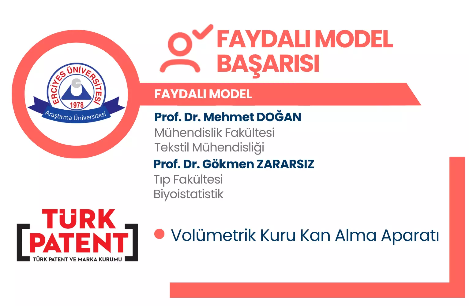 Fakültemiz Tekstil Mühendisliği Bölümü öğretim üyesi Prof. Dr. Mehmet DOĞAN ve Tıp Fakültesi Biyoistatistik Bölümü öğretim üyesi Prof. Dr. Gökmen ZARARSIZ tarafından geliştirilen "Volümetrik Kuru Kan Alma Aparatı” başlıklı faydalı model, Türk Patent ve Marka Kurumu tarafından tescil edilmiştir.