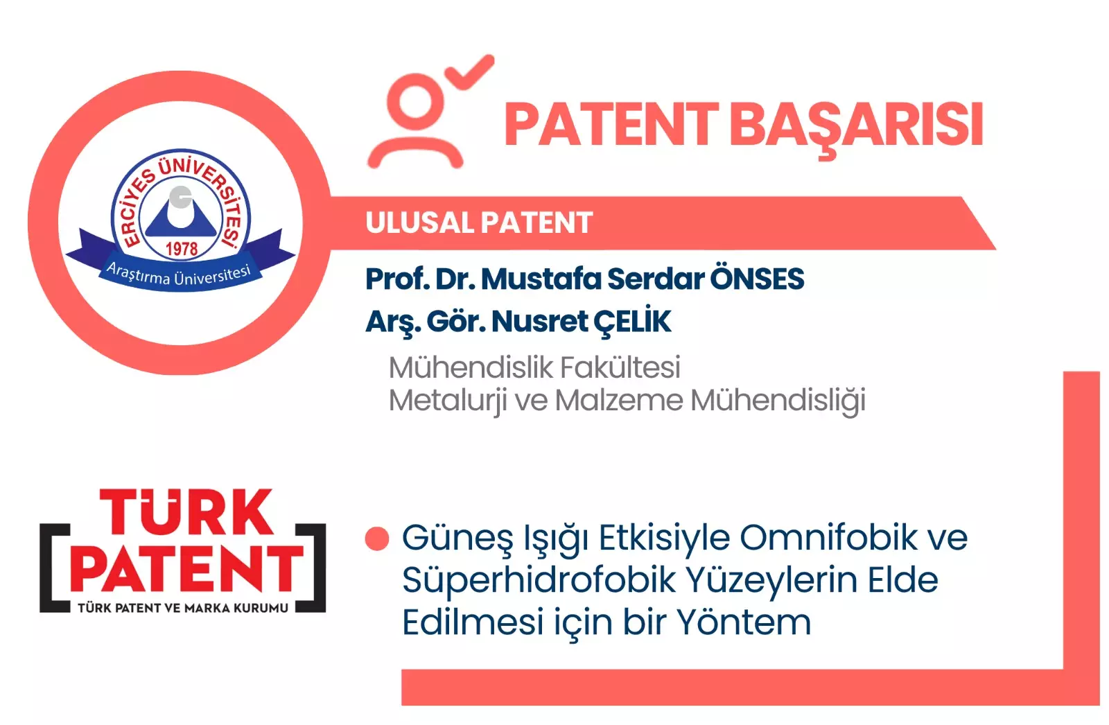 Fakültemiz Metalurji ve Malzeme Mühendisliği Bölümü öğretim üyesi Prof. Dr. Mustafa Serdar ÖNSES ve Arş. Gör. Nusret ÇELİK tarafından geliştirilen "Güneş Işığı Etkisiyle Omnifobik ve Süperhidrofobik Yüzeylerin Elde Edilmesi için Bir Yöntem" başlıklı ulusal patent, Türk Patent ve Marka Kurumu tarafından tescil edilmiştir.
